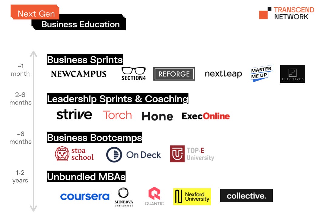 Business Sprints (~1 month): short-term learning programs around key business skills in a cohort environment. They often have a membership option to stay connected as alumni. Examples include NewCampus, Section 4, Reforge, MasterMeUp, NextLeap or Electives. We see this is the fastest-growing sector today.